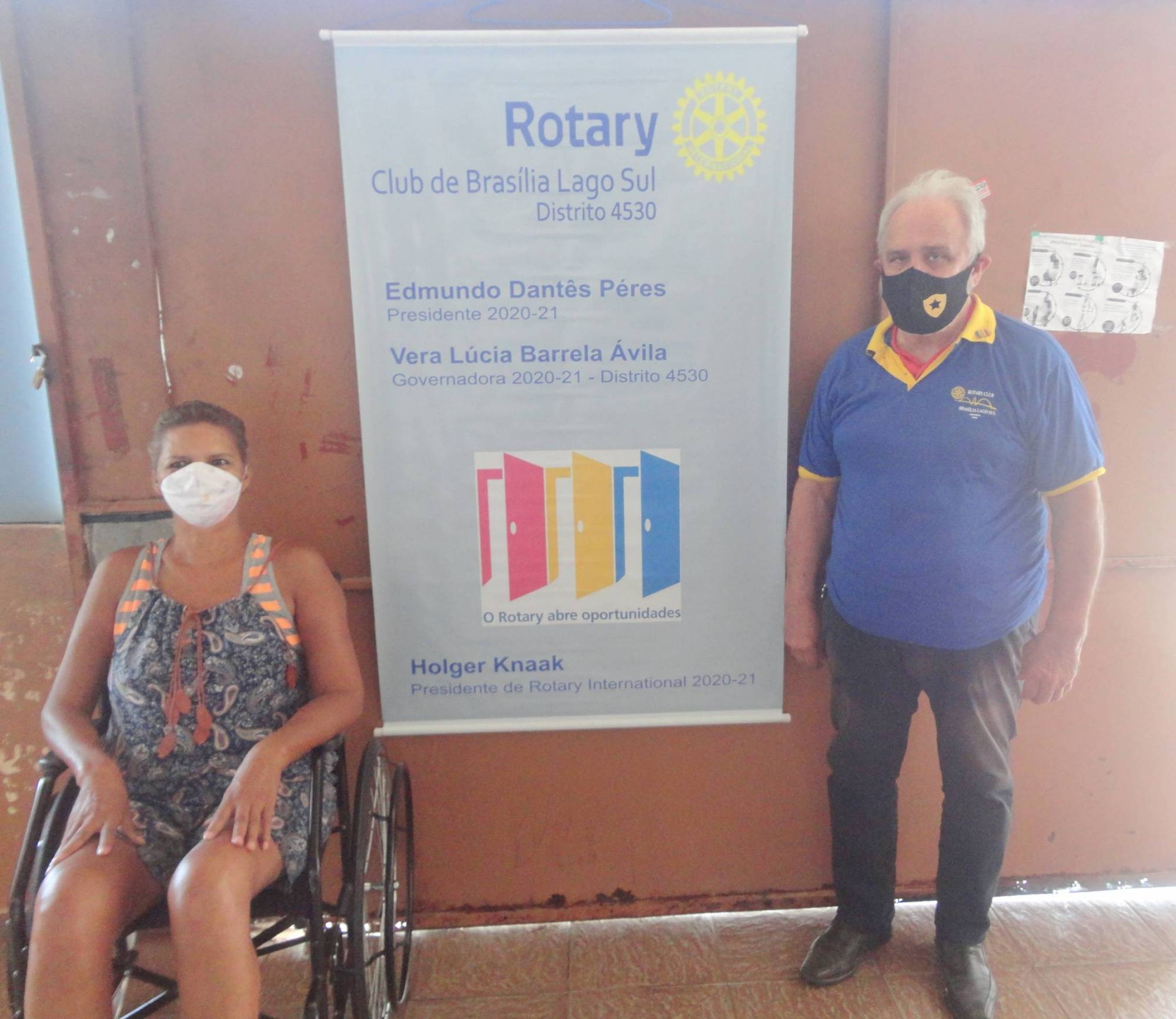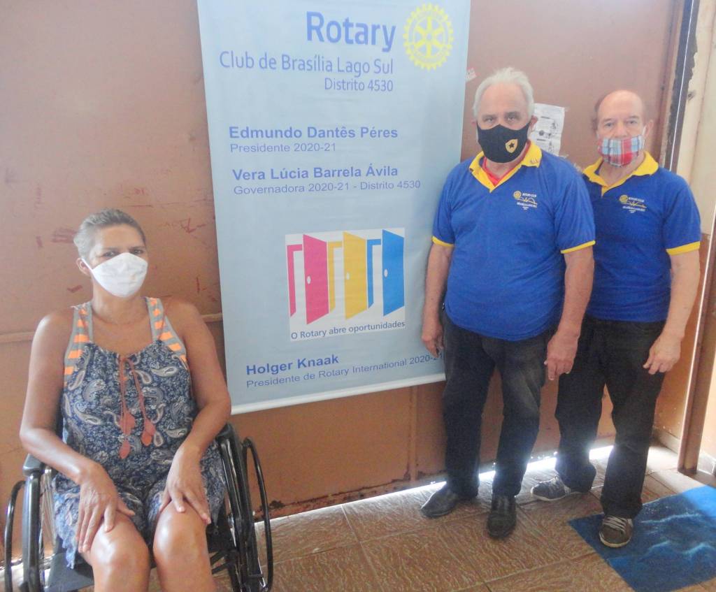 Rotary Club Brasília Lago Sul representado pelo presidente Edmundo Peres e o companheiro Jordivar Filgueira, através do "Banco de Cadeira de Rodas", doou dia 16/11 às 10:00 hs, mais uma cadeira para a senhora Licínia Maria dos Santos moradora da Ceilândia DF, ela tem dificuldade de locomoção, anda com apoio de um andador.