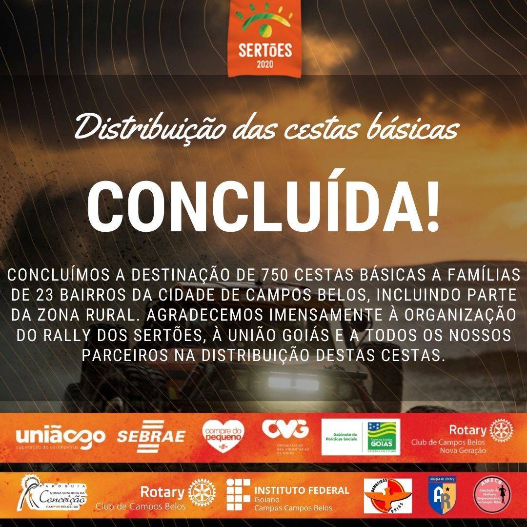 O Rotary Club de Campos Belos - Nova Geração tem o prazer de informar que 750 famílias, de 23 bairros da cidade de Campos Belos, incluindo a Zona Rural, estão sendo beneficiadas com cestas básicas doadas pelo Rally dos Sertões 2020.