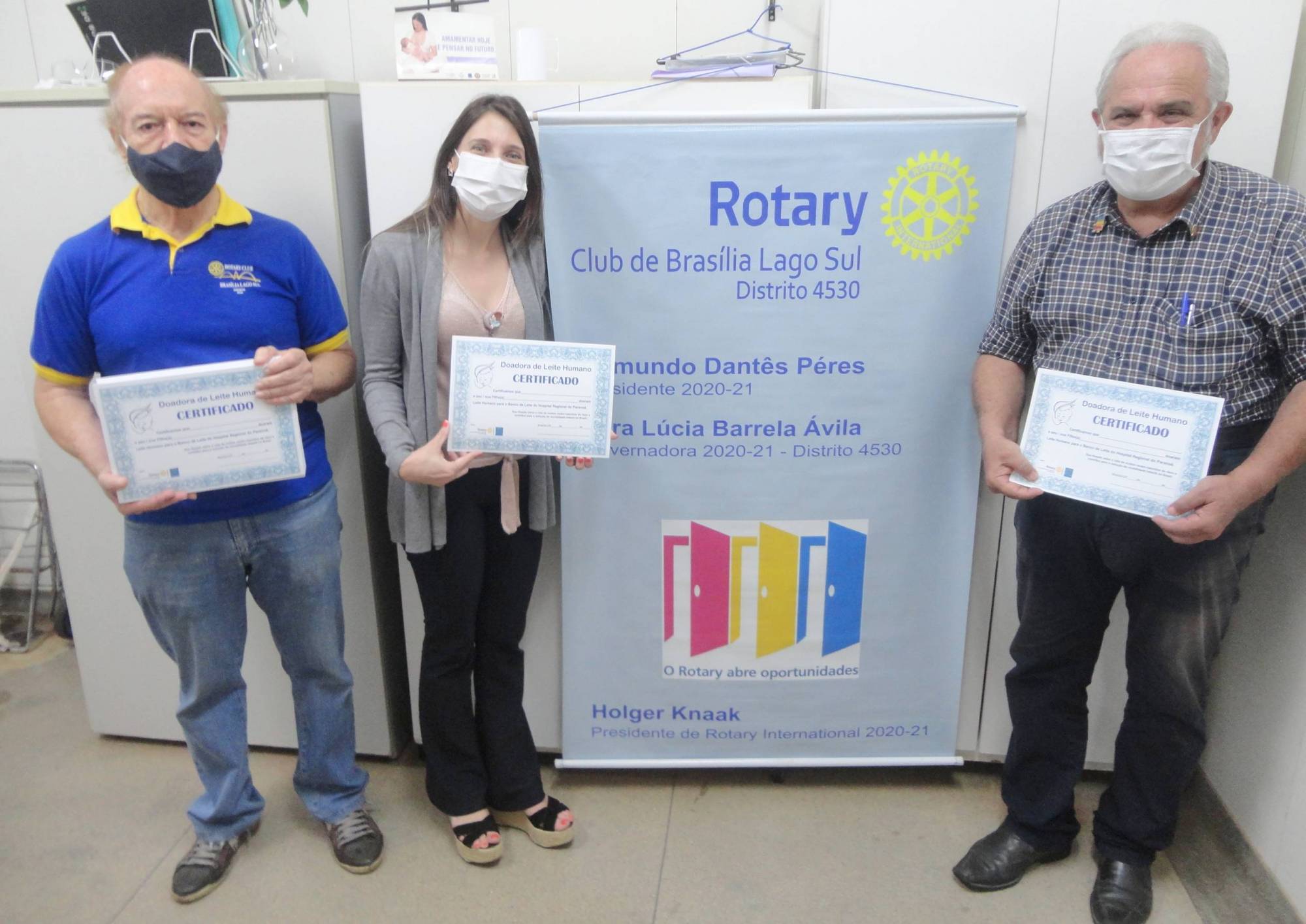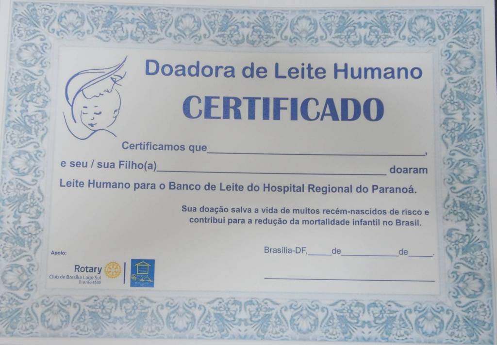 Rotary Brasília Lago Sul representado pelo presidente Edmundo Peres e Jordivar Filgueira, doou dia 11/12 às 10:00 hs ao “Banco de Leite Humano” do Hospital do Paranoá - DF, 100 certificados de homenagem às mães doadoras de leite materno. Estes certificados foram confeccionados de cortesia pela Gráfica Ideal do companheiro João Ferreira.