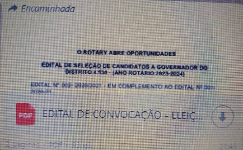 O ROTARY ABRE OPORTUNIDADES EDITAL DE SELEÇÃO DE CANDIDATOS A GOVERNADOR DO DISTRITO 4.530 - (ANO ROTÁRIO 2023-2024) EDITAL Nº 002- 2020/2021 - EM COMPLEMENTO AO EDITAL Nº 001- 2020-21 A Governadora do Distrito 4530, Vera Lúcia Barrela Ávila e o Presidente da Comissão Eleitoral Alberto Sousa Brito ano 2019-2020 adotam o presente edital para Escolha do Governador Indicado 2023-2024, de acordo com as suas atribuições e o que dispõe os Artigos 12 do Regimento Interno de Rotary International (Manual de Procedimento de 2020), seções 12.010 e 16.020, com observância à Resolução nº 001/2019-2020 aprovada na 64ª Conferência Distrital e; Considerando as providencias necessárias para a realização do processo eleitoral, de escolha do Governador do Distrito 4530 para o ano rotário 2023-24. Considerando as formas usuais de eleição disponíveis ao Distrito 4530, entre elas a eleição online, a eleição presencial durante a conferência do distrito ou a eleição via correio destinada a escolha do Governador do Distrito 4530 ano 2023-24. Considerando a praticidade da eleição online, já realizada com experiência exitosa no rotário 2019-20, Resolve: Art. 1º Fica definida a eleição para a escolha do Governador(a) Indicado(a) para o ano rotário 2023-24 do Distrito 4.530, a ser realizada de forma eletrônica, dia 22 de maio de 2021, no horário compreendido das 08 às 17 horas. Art. 2º O sistema de coleta de votos e apuração acontecerá por meio eletrônico, com o recebimento de senha dirigida aos e-mails dos eleitores, com 48 horas de antecedência do pleito. Art. 3º Serão cadastrados todos os e-mails dos Eleitores Votantes no pleito a ser realizado, compondo o rol de eleitores os Presidentes de Clubes e Governadores do Distrito. Paragrafo Primeiro: Cada clube ou Governador de Distrito, deverá informar à Presidência da Comissão Eleitoral ou a Secretaria do Distrito, até o dia 20 de abril, o e-mail que será utilizado para operacionalizar o sistema, inclusive, para recebimento da senha de acesso para votação. Paragrafo Segundo: O sistema emitirá comprovante de votação, preservando o devido sigilo do voto, sem identificação do votante, e ao final do processo eleitoral, apenas o resultado e quantitativos do escrutínio será fornecido ao presidente da Comissão Eleitoral. Art. 4º Os clubes, para exercerem o direito de voto, deverão estar adimplentes com suas obrigações pecuniárias junto a Rotary Internacional. Parágrafo Único: Os Clubes terão direito ao quantitativo de votos baseado no número de associados, conforme previsto no Manual de Procedimentos pelo que as instâncias competentes da Governadoria do Distrito emitirão listas atualizadas, segundo determinações das legislações Distrital e RI. Art. 5º Cada candidato poderá indicar ao Presidente da Comissão Eleitoral um fiscal para acompanhar o desenrolar de todo processo eleitoral. Art. 6º - As dúvidas dos Clubes e Governadores poderão ser sanadas por consulta ao Presidente da Comissão Eleitoral, Governador Alberto Sousa Brito, sempre preferencialmente pelo e-mail: [email protected]. Art. 7º - Este Edital entrará em vigor na data de sua publicação no site do Distrito 4.530. Araguaína-To., 22 de março de 2021. Alberto Sousa Brito PRESIDENTE DA COMISSÃO ELEITORAL