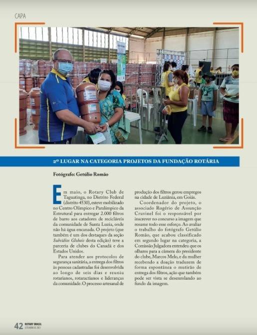 O Rotary Club de Taguatinga ganhou o 2º lugar no Concurso de Fotos “Pessoas em Ação” (página 42) promovido com uma parceria inédita, da RIBO, da revista Rotary Brasil e a Coordenadoria Regional de Imagem Pública.