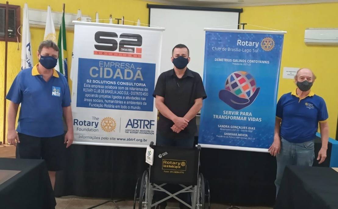 O Rotary Club Brasília Lago Sul sob a presidência do companheiro Demetrius Contoyannis, com a participação do companheiro Jordivar Filgueira, dia 19/10/21 às 15:00 horas, mais uma vez promovendo melhor qualidade de vida, na doação de 01 cadeira de rodas para uma senhora de 88 anos, Marina Gomes da Silva moradora do Cruzeiro Novo - DF.