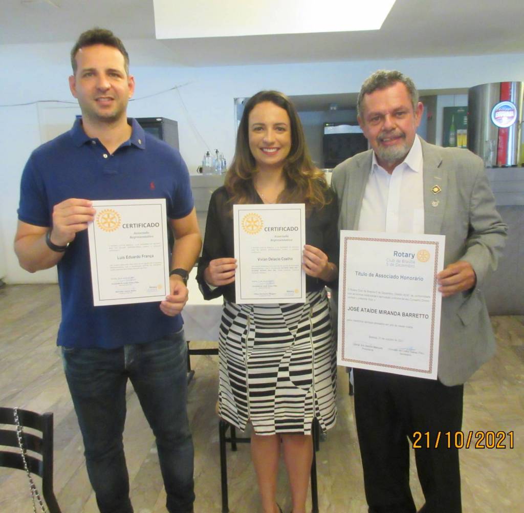 Com os trabalhos do diretor de protocolo Gd 2002-3 Chico Schlabitz, foi aberta a reunião pelo presidente Gilmar Marques, em seguida a solenidade de posse de associados representativos: a companheira Vivian Delácio, classificação "Estudos pela Paz - Alumina Rotary pela Paz", afilhada do companheiro Chico, e o companheiro Luiz Eduardo classificação "Gestão de Projetos", afilhado do companheiro Ataíde, os dois foram agraciados com um Certificado de Associado Representativo.