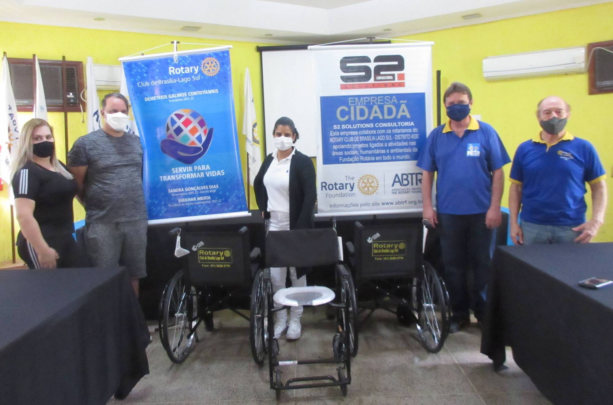 O Rotary Club Brasília Lago Sul através do seu projeto "Banco de Cadeira de Rodas", com a presença do presidente Demetrius Contoyannis e o coordenador do BCR Jordivar Filgueira, doou 02 cadeiras de rodas e 01 de banho no dia 19/11/21 às 10:00 horas, na sede da Fundação de Rotrianos de Brasília.