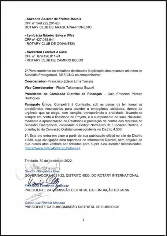 A fim de efetivar a liberação do recurso, a Governadora Sandra Gonçalves Dias publica oficialmente o Ato Administrativo nº3 2021-22 que designa Comissão de associados para implementar e gerir recursos do Subsídio Emergencial da Fundação Rotária, destinado a socorrer vítimas de catástrofes pluviais nas regiões afetadas no Distrito 4530, bem como a sua Coordenação.