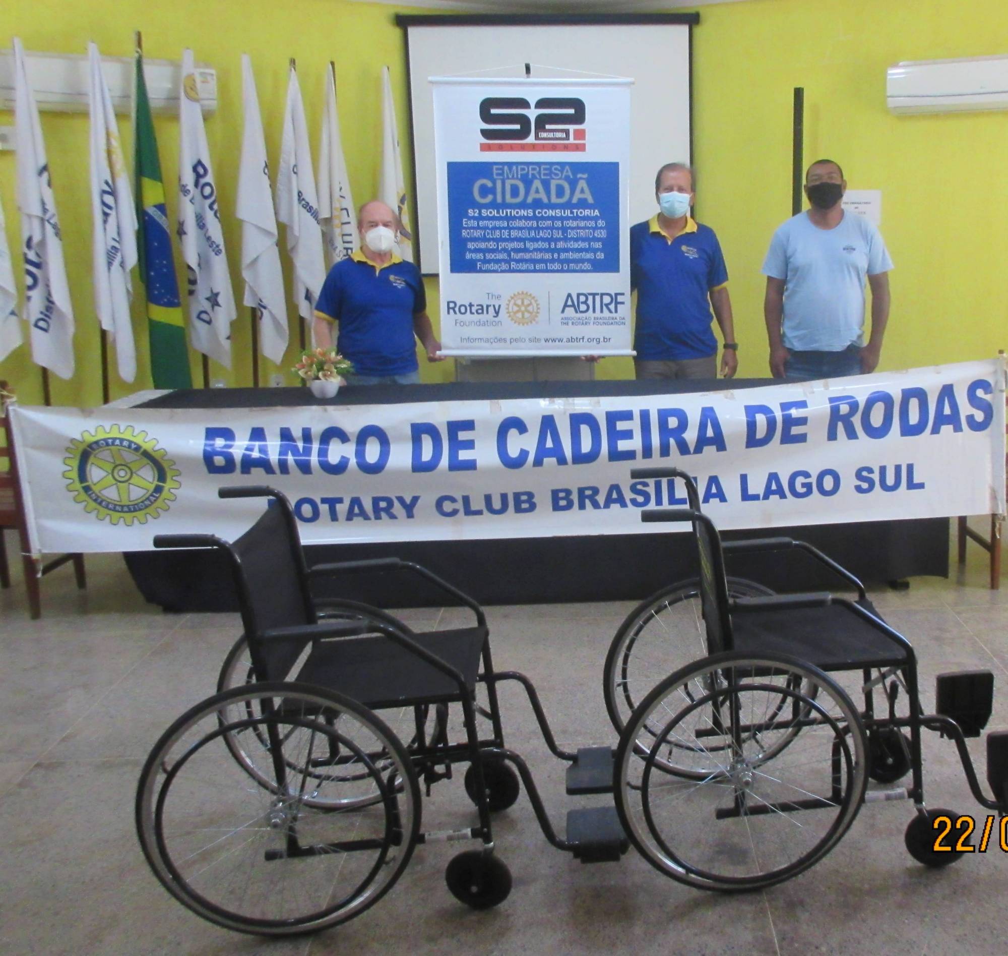 O Rotary Club Brasília Lago Sul sob a presidência do companheiro Demetrius Contoyannis, representado pelos companheiros: João Amaral e Jordivar Filgueira, doou 02 cadeiras de rodas, dia 22/2/22 às 10:30 horas, na Fundação de Rotarianos de Brasília. O presidente Demetrius, devido estar viajando, não pôde participar.