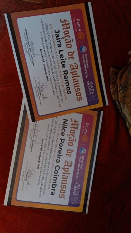 Foram entregues Certificados "MOÇÃO DE APLAUSOS" do Distrito 4530, assinados pela Gov. Sandra Gonçalves Dias e pela companheira Cacá ZInato, às lideranças femininas da Vila Planalto, pelos relevantes serviços humanitários prestados à comunidade.