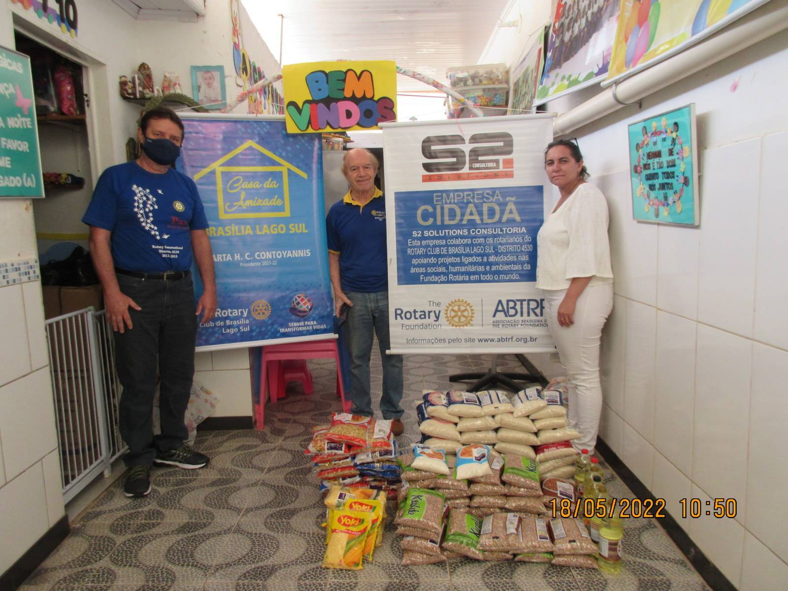 Mais 138,300 kg de alimentos: arroz, feijão, óleo, flocão, macarrão e açúcar, foram doados dia 18/5/22 às 10:00 horas, à Creche São Francisco, sediada na cidade da Estrutural - DF. Esta doação foi realizada pelo Rotary Club Brasília Lago Sul representado pelo seu presidente Demetrius Contoyannis acompanhado do companheiro Jordivar Filgueira, em parceria com Grupo Pão de Açúcar da campanha de alimentos iniciada em março de 2022. Estes alimentos foram arrecadados da loja 1233 da W3 508 norte Brasília DF.