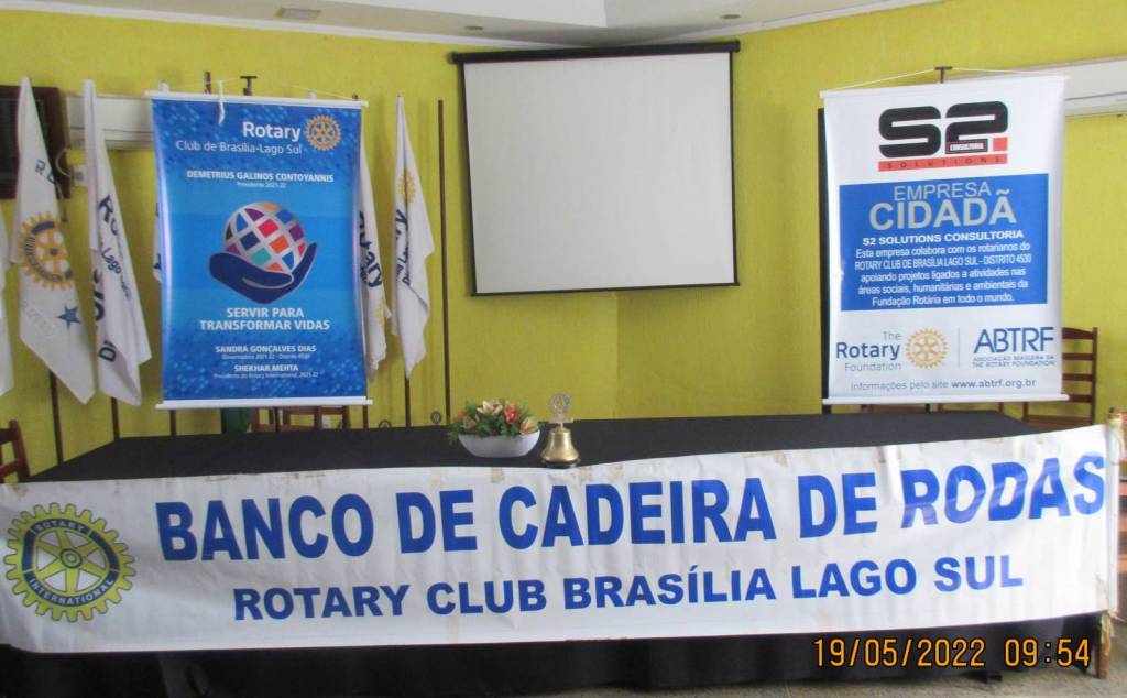 O Rotary Club Brasília Lago Sul sob a presidência do companheiro Demetrius Contoyannis, representado pelo companheiro Jordivar Filgueira e Roger Brock, dia 19/5/22 às 10:00 horas, na sede da Fundação de Rotarianos de Brasília, doou 04 cadeiras de rosas e de banho, e uma bota ortopédica.