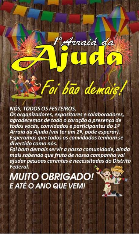 Foi realizado neste sábado, 28 o primeiro Arraiá Comunitário em uma iniciativa do Lions Clube Brasília Taguatinga que conseguiu adesão dos outros 3 Lions clube de Taguatinga a participação do LIONS Clube Brasília Buriti e do Lions Clube Sobradinho, do Rotary Taguatinga Norte, o Rotary Clube de Taguatinga e suas Casa da Amizade, Colégio Ideal, uma Loja Maçônica e colaboração de 5 paroquias.