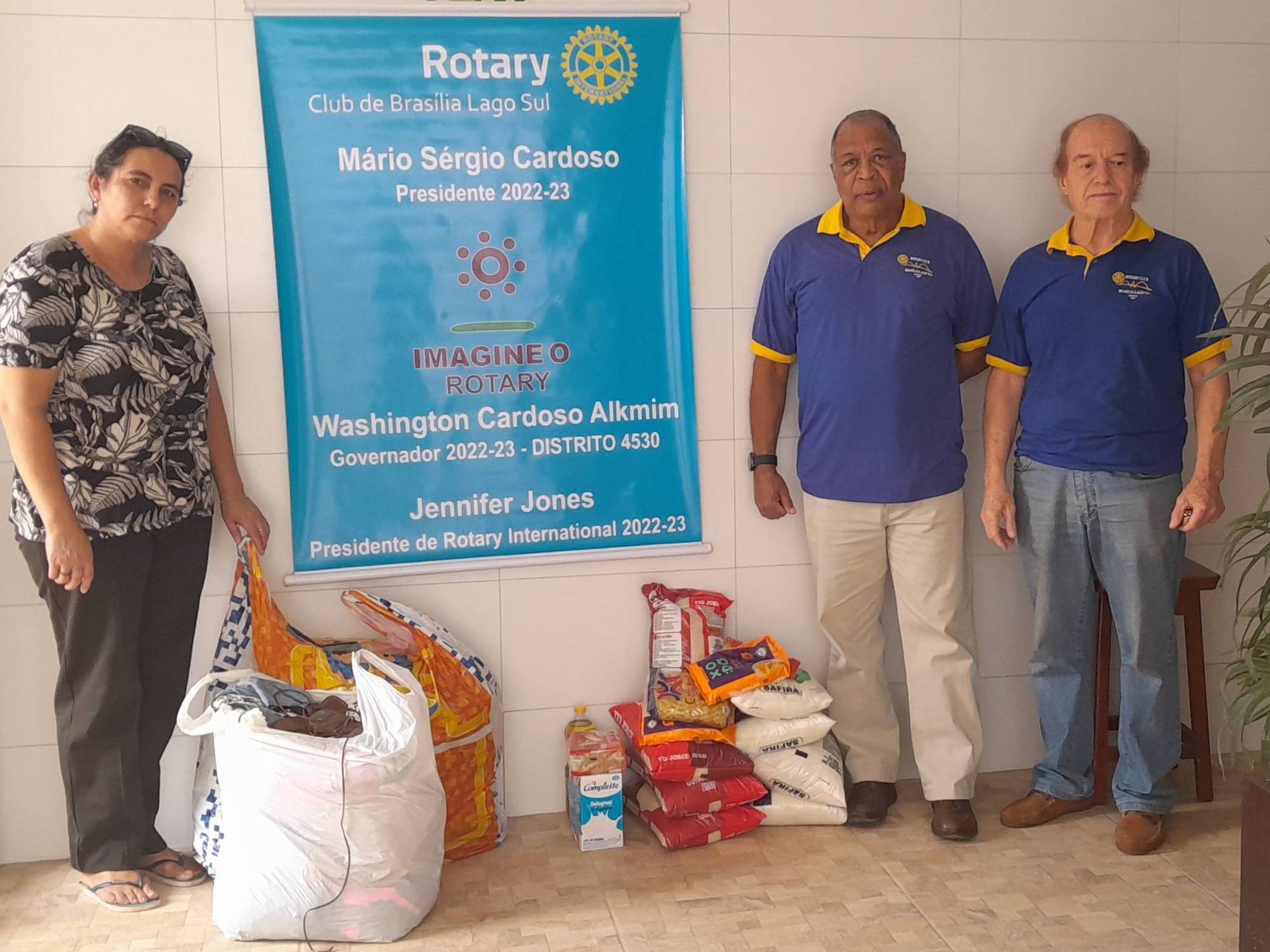 Dia 24/10/22 às 15:00 hs, o Rotary Brasília Lago Sul representado pelo presidente Mário Sérgio Cardoso e o companheiro Jordivar Filgueira, doou 67,590 kd de alimentos: arroz, feijão, açúcar, leite, achocolatado, café, flocão, pão de forma, bolacha, macarrão e molho de tomatee muitas roupas e calçados.