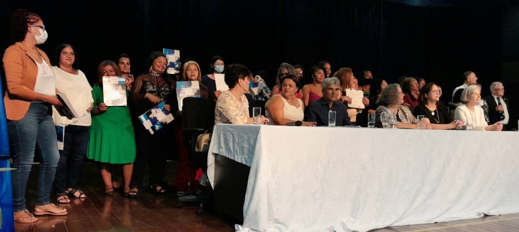 Após todos cantarem o hino nacional, cada componente da mesa deixou sua mensagem de agradecimento e de saudação aos alunos pela conclusão do curso de alfabetização.