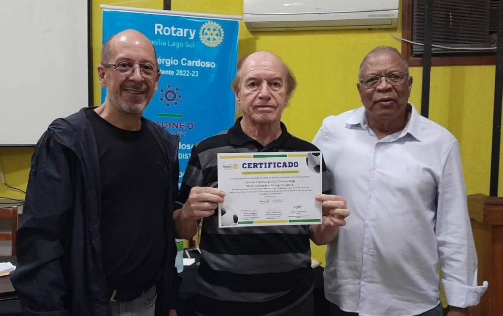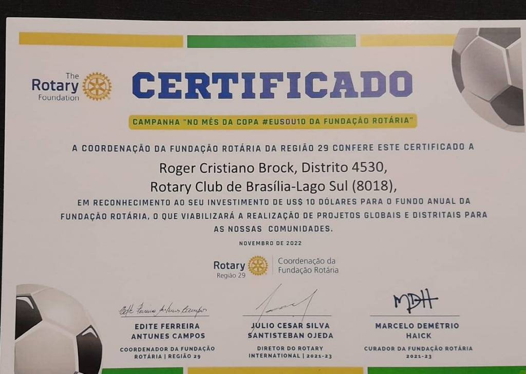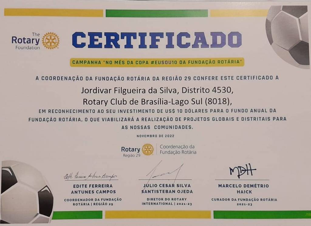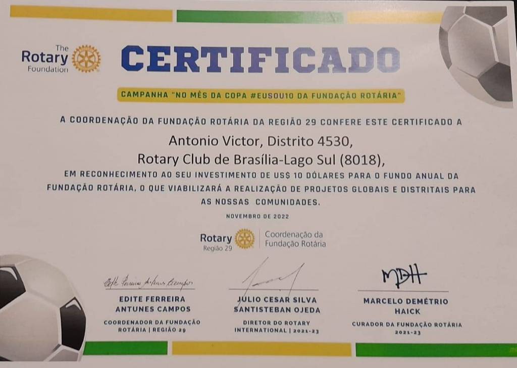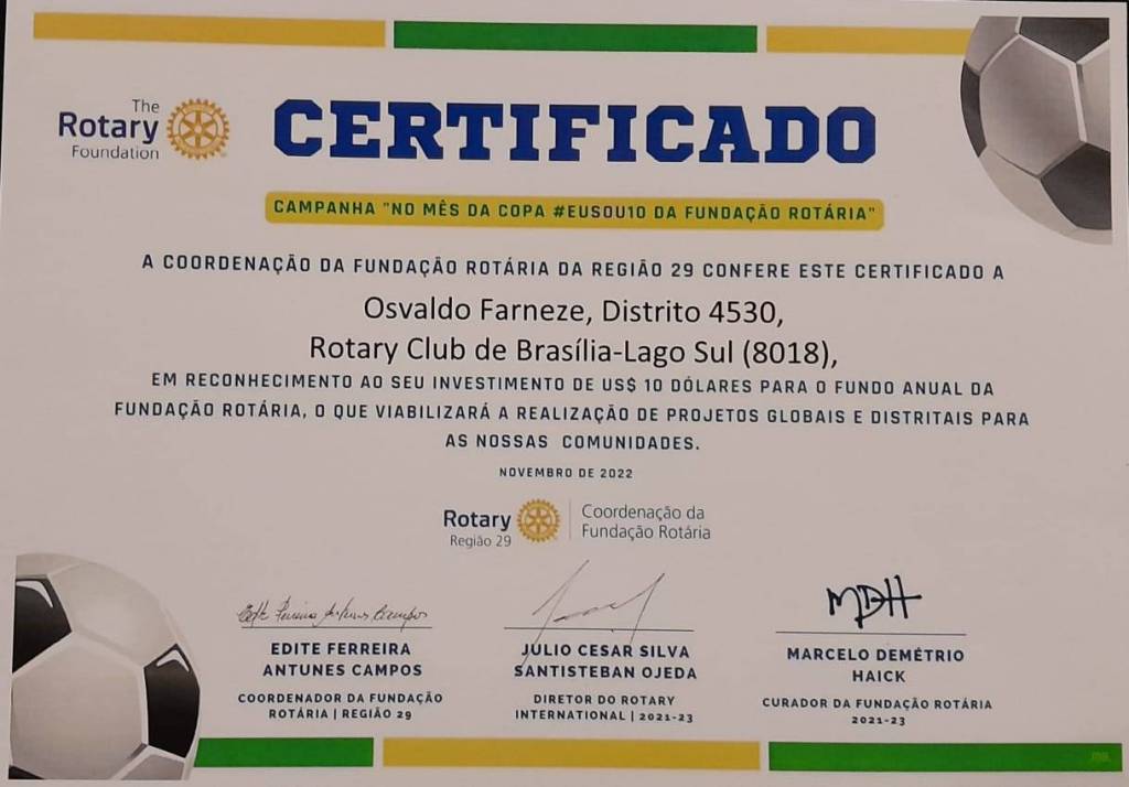 Na reunião do dia 27/01/23 às 20:00 hs na sede da Fundação de Rotarianos de Brasília, do Rotary Club Brasília Lago Sul presidido pelo companheiro Mário Sérgio, o companheiro Osvaldo Farneze presidente da Comissão de Fundação Rotária do clube, fez a entrega solene de certificados Honoríficos da Fundação da Rotária, da Campanha "No Mês da Copa #EuSou10 da Fundação Rotária", em reconhecimento aos 10 associados que fizeram doação de 10 dólares para o Fundo Anual da Fundação Rotária.