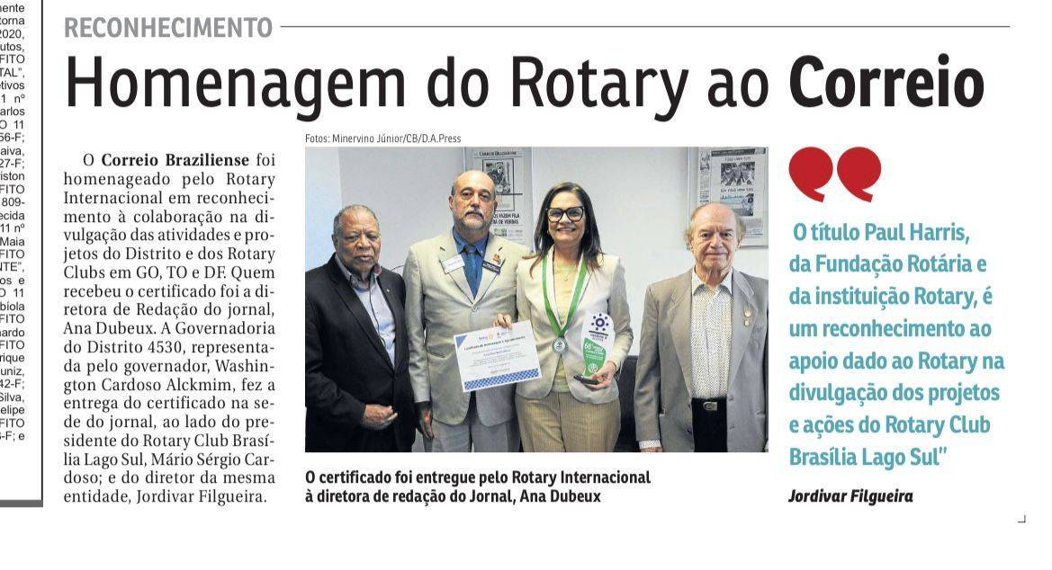 Matéria no Jornal Correio Brasiliense do dia 24/06/23, sobre a homenagem que o Distrito 4530 e o Rotary Club Brasília Lago Sul, proporcionaram ao Jornal na pessoa da Ana Dubeux diretora de redação.