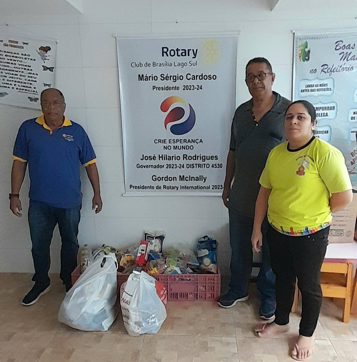 Dia 15/8 às 11:00 hs terça-feira, o Rotary Club Brasília Lago Sul, representado pelo presidente Mário Sérgio Cardoso e Jordivar Figueira, doou mais 61,10 kg de alimentos, arrecadados dia 12/8/23 dos mercados Pão de Açúcar da W3 Sul 516, W3 Sul 308/9, W3 Norte 508/9 e do Guará, inclusive foram arrecadados pela Casa da Amizade do clube diversas roupas, também doadas para a Creche São Francisco na Cidade Estrutural - DF.