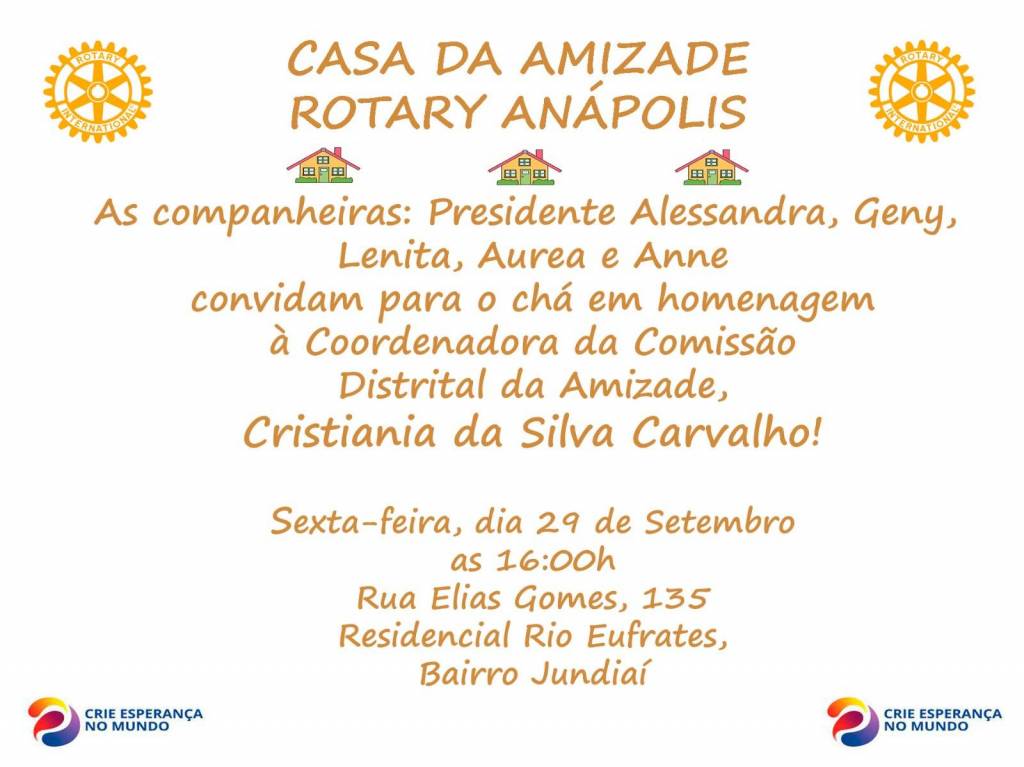 Na tarde do dia 29 de setembro, as companheiras da Casa da Amizade do Rotary Club de Anápolis ofereceram um delicioso chá para a Coordenadora Distrital Cris Carvalho.
