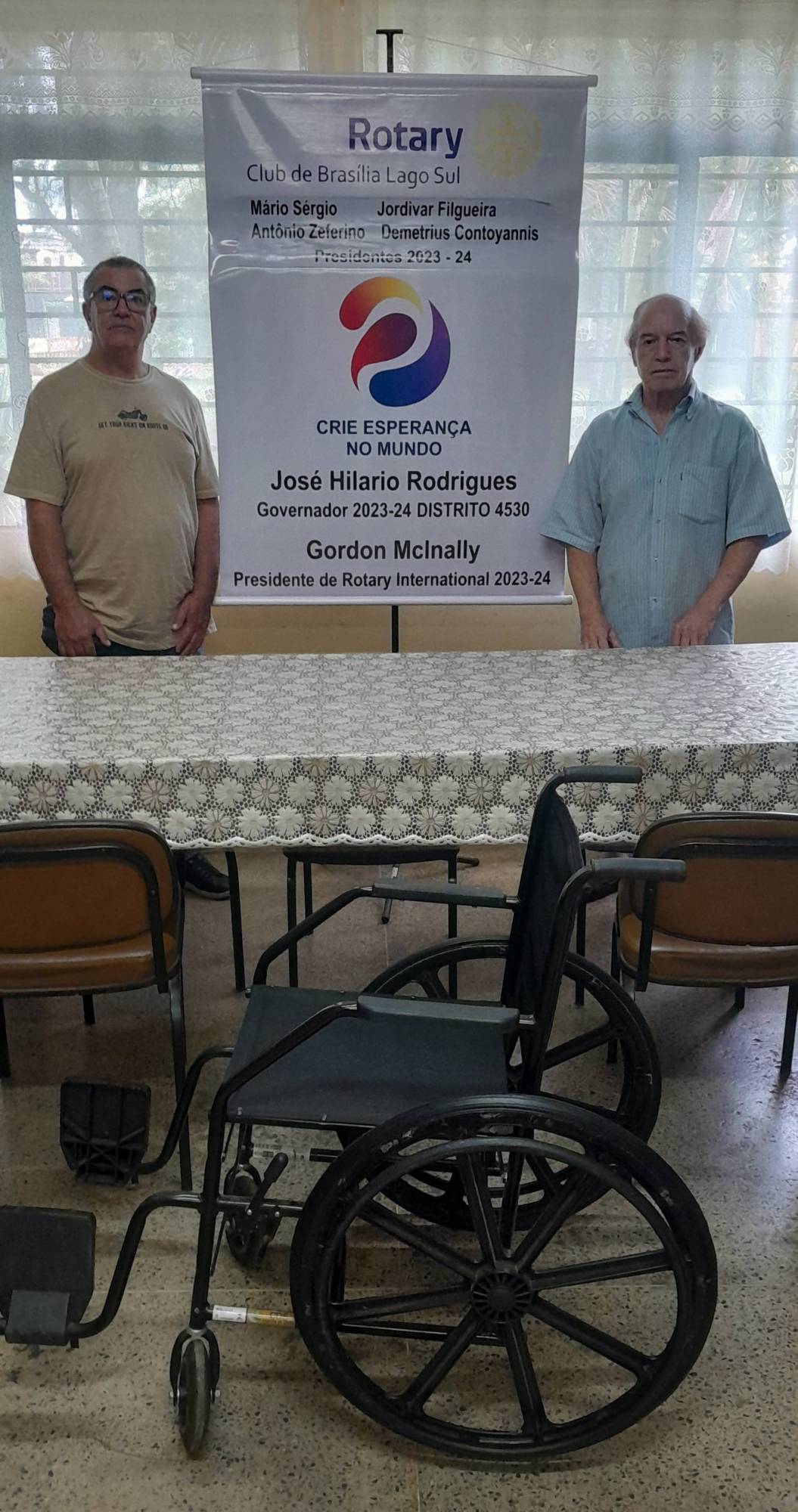 Dia 21/12/23 quinta-feira, o Rotary Club Brasília Lago Sul sob a presidência do companheiro Antonio Zeferino, representado pelo companheiro Jordivar Filgueira, doou 01 cadeira de rodas.