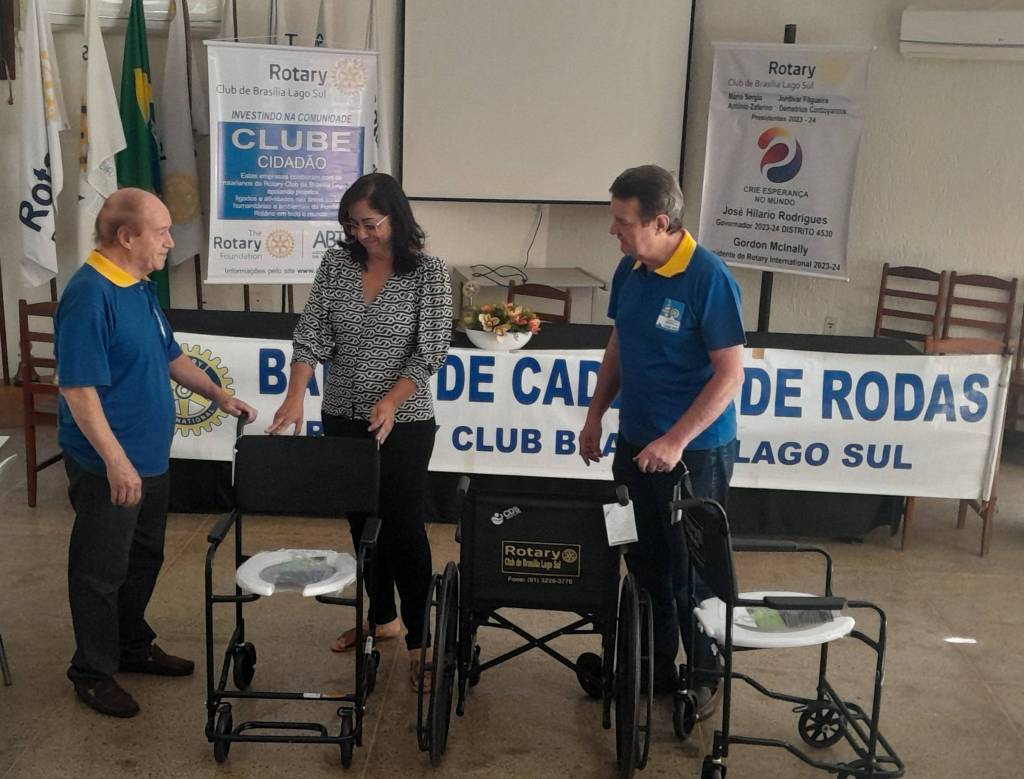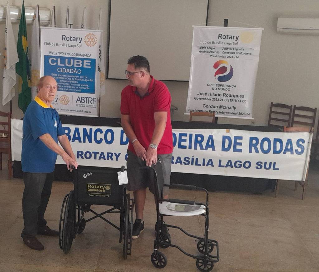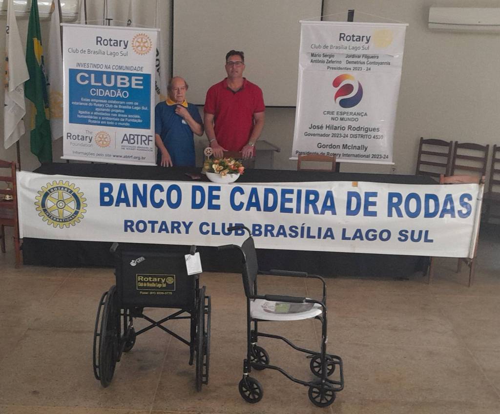 Na constância do servir o Rotary Club Brasília Lago Sul, sob a presidência do companheiro Demetrius Contoyannis, acompanhado do coordenador do "Banco de Cadeira de Rodas", companheiro Jordivar Filgueira, doou dia 21/05/24 às 10:00 hs terça-feira, na sede da Fundação de Rotarianos de Brasília, 01 cadeira de rodas e 02 de banho.