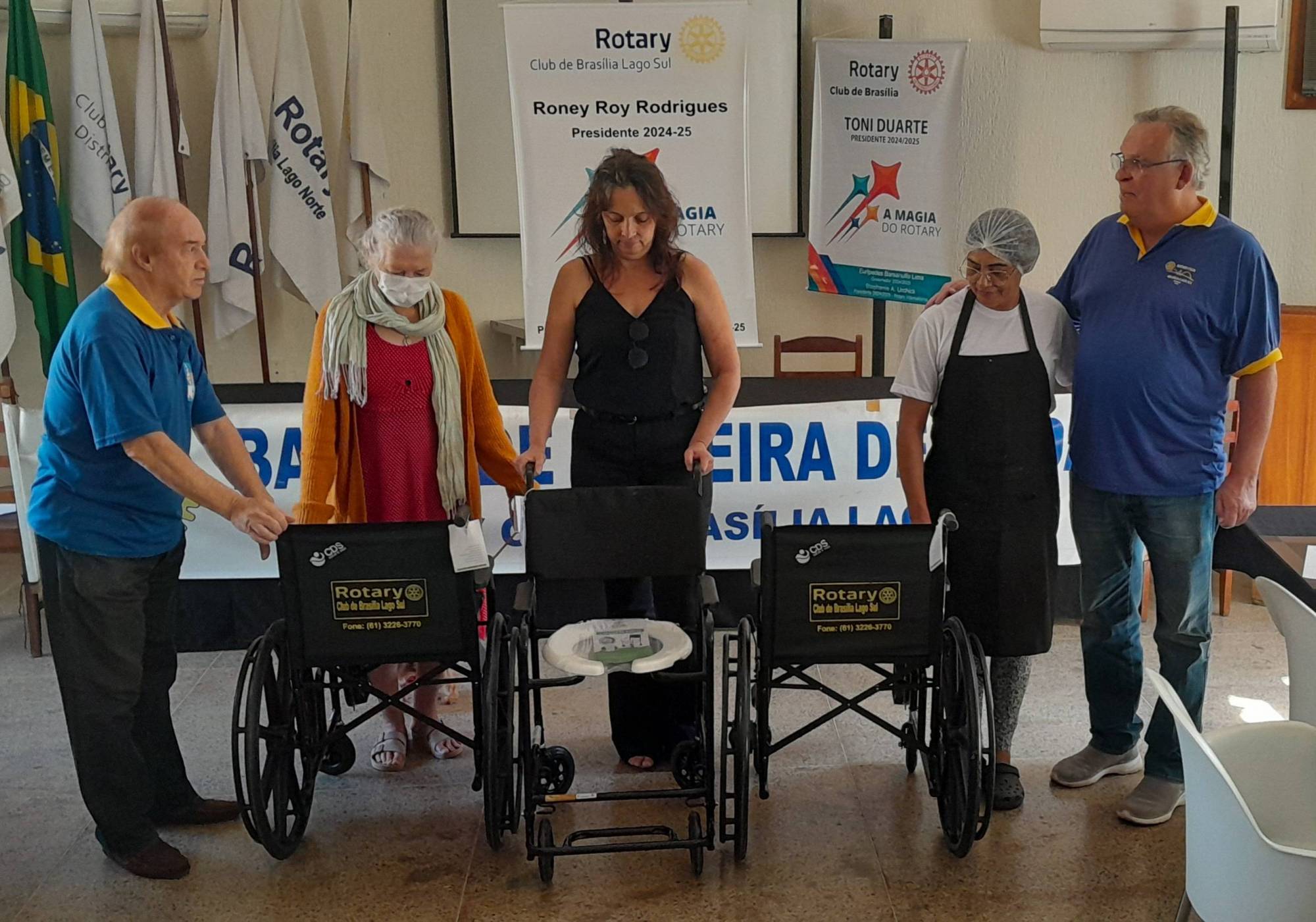 Proporcionando melhor qualidade de vida, o Rotary Club de Brasília Lago Sul sob a presidência do companheiro Roney Rodrigues, representado pelo vice-presidente Antônio Zeferino, e o coordenador do "Banco de Cadeira de Rodas" Jordivar Filgueira, doou mais 03 cadeiras de rodas, dia 26/07/24 às 10:30 hs sexta-feira, na sede da Fundação de Rotarianos de Brasília.