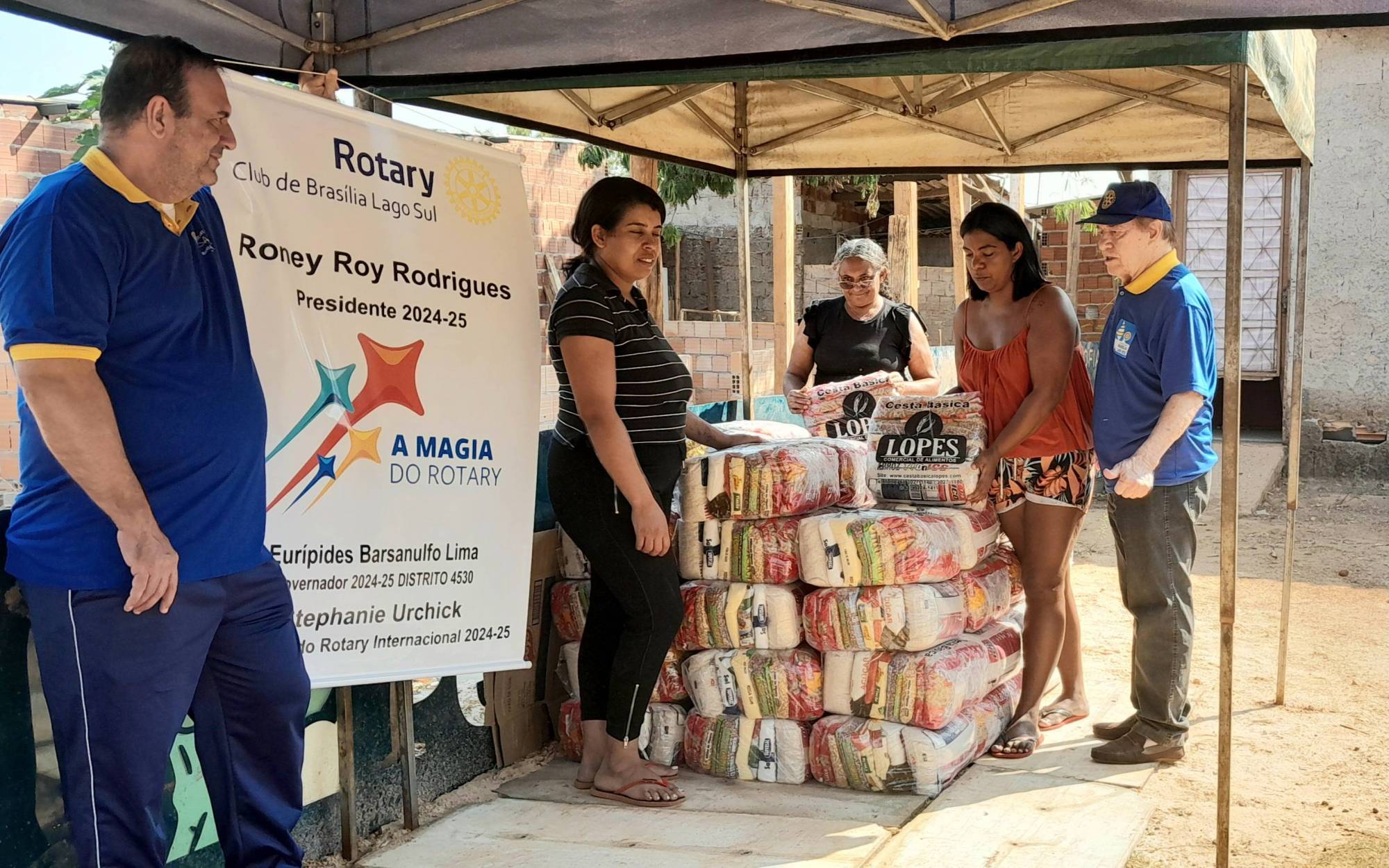 O Rotary Club de Brasília Lago Sul presidido pelo companheiro Roney Roy, representado pelos companheiros Álvaro e Jordivar, na cotínua "Campanha de Alimentos em parceria com o Mané Mercado, R2 Produções e Fome de Música, dia 05/10/24 sábado às 9:00 hs, doou 50 cestas básicas (15,50kg cada) 775 kg de alimentos para "Favelinha Vive", numa invasão na cidade de Samambaia Norte.