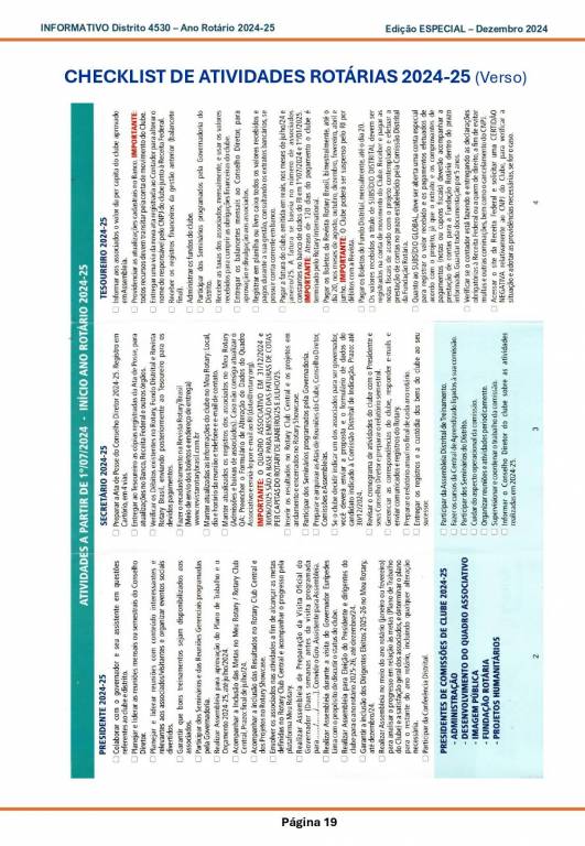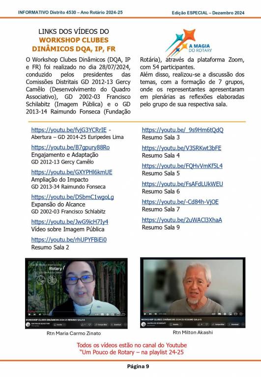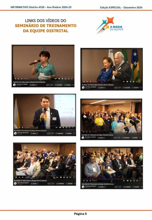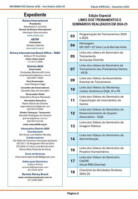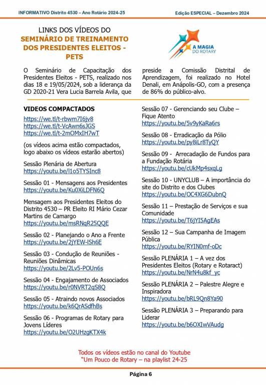 Caros líderes de 2024-25, vamos recordar os treinamentos e seminários do ano rotário 2024-25, promovidos em 2024, sob a coordenação da Facilitadora de Aprendizagem GD 2020-21, Vera Lucia Barrela Avila. Para isso, confiram o Informativo Especial de dezembro de 2024, que contém os links para os treinamentos e seminários. Trata-se de uma valiosa fonte de conhecimento rotário, repleta de ótimas palestras.