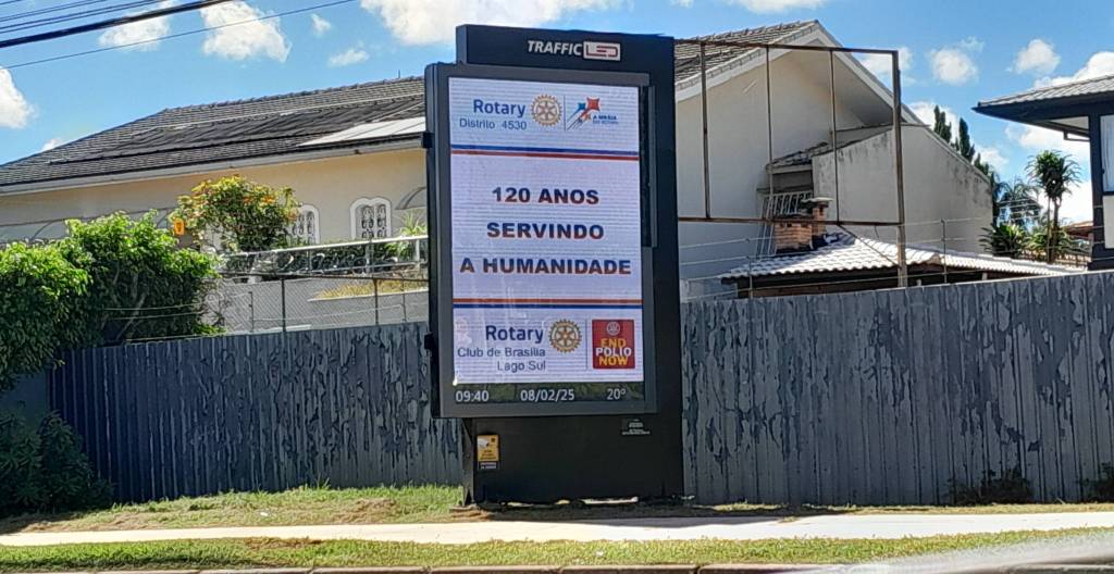 Painéis eletrônicos expostos em 16 localidades estratégicas do DF, onde passam milhares de carros, divulgando os "120 anos de Rotary International", que completará dia 23/02/25. Trabalho da Imagem Pública do Rotary Club de Brasília Lago Sul, com a parceria da empresa "TRAFFIC-PAINEIS LED".