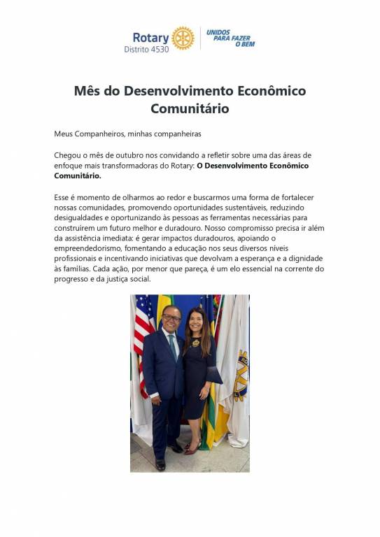 Mês do Desenvolvimento Econômico Comunitário Meus Companheiros, minhas companheiras Chegou o mês de outubro nos convidando a refletir sobre uma das áreas de enfoque mais transformadoras do Rotary: O Desenvolvimento Econômico Comunitário. Esse é momento de olharmos ao redor e buscarmos uma forma de fortalecer nossas comunidades, promovendo oportunidades sustentáveis, reduzindo desigualdades e oportunizando às pessoas as ferramentas necessárias para construírem um futuro melhor e duradouro. Nosso compromisso precisa ir além da assistência imediata: é gerar impactos duradouros, apoiando o empreendedorismo, fomentando a educação nos seus diversos níveis profissionais e incentivando iniciativas que devolvam a esperança e a dignidade às famílias. Cada ação, por menor que pareça, é um elo essencial na corrente do progresso e da justiça social.