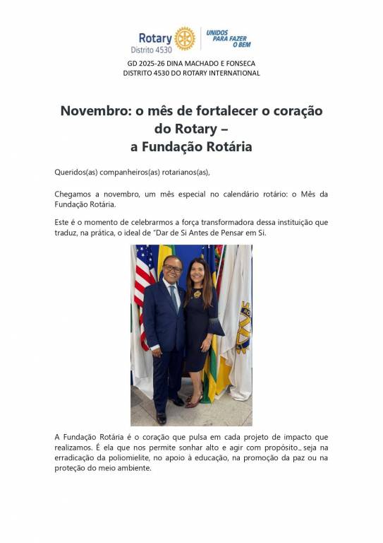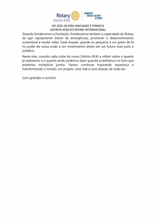 GD 2025-26 DINA MACHADO E FONSECA DISTRITO 4530 DO ROTARY INTERNATIONAL Quando fortalecemos a Fundação, fortalecemos também a capacidade do Rotary de agir rapidamente diante de emergências, promover o desenvolvimento sustentável e mudar vidas. Cada doação, grande ou pequena, é um gesto de fé no poder da nossa união e um investimento direto em um futuro mais justo e solidário. Neste mês, convido cada clube do nosso Distrito 4530 a refletir sobre o quanto já realizamos e o quanto ainda podemos fazer quando acreditamos no bem que podemos multiplicar juntos. Vamos continuar inspirando esperança e transformando o mundo, um projeto, uma vida e uma doação de cada vez. Com gratidão e carinho!