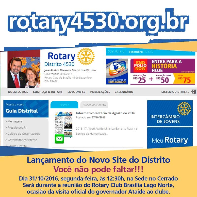 Dia 31.10.2016, segunda-feira, às 12:30h, na Fundação de Rotarianos de Brasília (Sede do Cerrado)