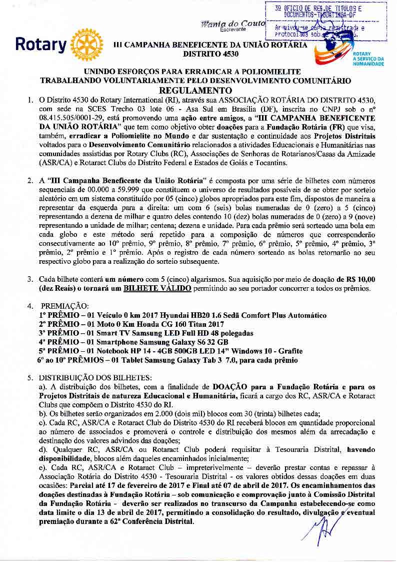 1. O Distrito 4530 do Rotary Intemational (RI), através sua ASSOCIAÇÃO ROTÁRIA DO DISTRITO 4530, com sede na SCES Trecho 03 lote 06 - Asa Sul em Brasília (DF), inscrita no CNPJ sob o nº 08.415.505/0001-29, está promovendo uma ação entre amigos, a “III CAMPANHA BENEFICENTE DA UNIÃO ROTÁRIA” que tem como objetivo obter doações para a Fundação Rotária (FR) que visa, também, erradicar a Poliomielite no Mundo e dar sustentação e continuidade aos Projetos Distritais voltados para o Desenvolvimento Comunitário relacionados a atividades Educacionais e Humanitárias nas comunidades assistidas por Rotary Clubs (RC), Associações de Senhoras de Rotarianos/Casas da Amizade (ASR/CA) e Rotaract Clubs do Distrito Federal e Estados de Goiás e Tocantins.