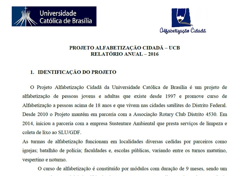 O projeto "Alfabetização Cidadã" da UCB-Universidade Católica de Brasília, tem parceria com vários Rotary Clubs do Distrito Federal, Casas da Amizade e Fundação de Rotarianos de Brasília.