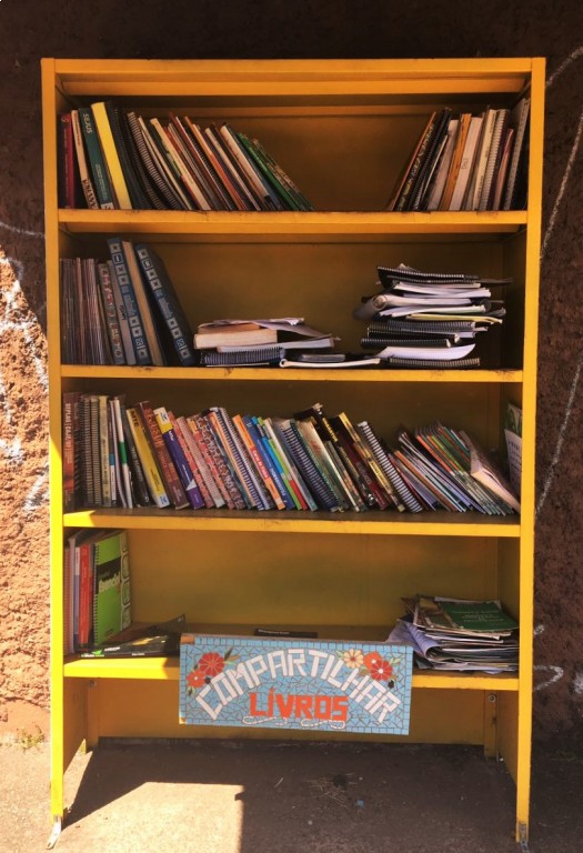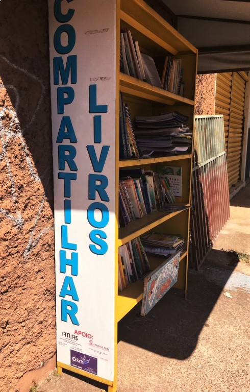 Foi feita a estante para recolher os livros, e um toldo para não só proteger os livros, mas todos que frequentam o local.