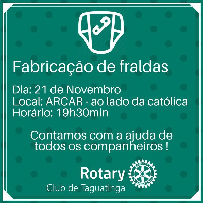 O Rotary e a Casa da Amizade de Taguatinga irão nesta Terça Feira dia 21-11-2017 confeccionar fraldas na ARCAR para atender a futura solicitação da comunidade.