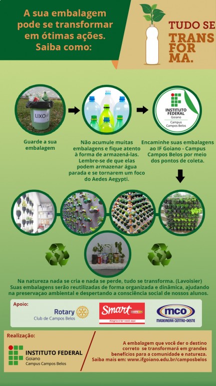Também apoiam este projeto o Supermercado Smart Compre Bem (ponto de coleta) e a Madeireira Centro-Oeste. Para ajudar o projeto você só precisa separar as suas embalagens (garrafas Pet, caixas de suco e leite, etc.) e deixar em um dos pontos de coleta na cidade. Até o momento, são três pontos de coleta: Supermercado Smart Compre Bem, Rotary Club de Campos Belos e o próprio IF Goiano - Campus Campos Belos. Essas embalagens serão utilizadas na produção de mudas nativas do cerrado que serão plantadas em áreas próximas às nascentes.