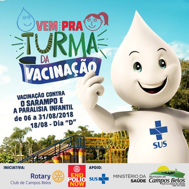 O Rotary Club de Campos Belos, em parceria com a Secretaria Municipal de Saúde de Campos Belos, será um posto de vacinação no próximo dia 18 de agosto, sábado, DIA D de combate à poliomelite e ao sarampo.