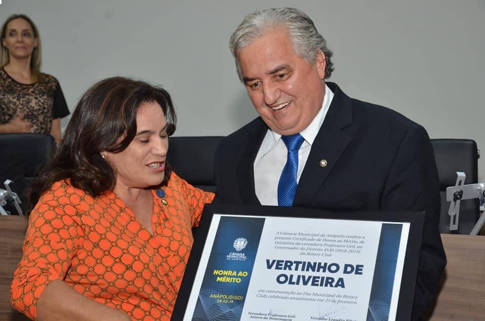 A Câmara de Anápolis em reconhecimento aos serviços rotários, no dia 28, fez homenagem ao dia municipal do Rotary. O governador do distrito 4530, Vertinho de Oliveira, agradeceu o diploma de Honra ao Mérito “Obrigado a vereadora Gerli pelo título nos concedido e aos companheiros anapolinos”, disse.