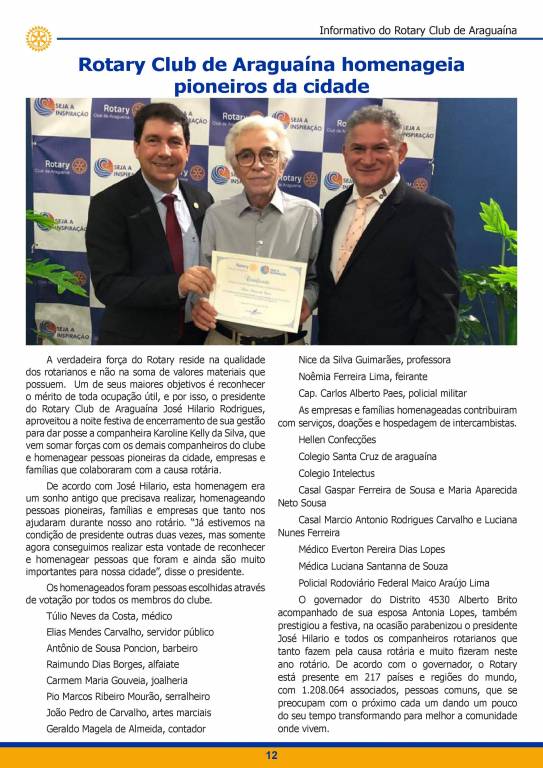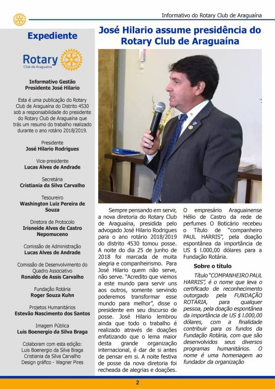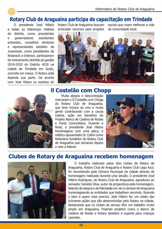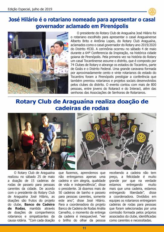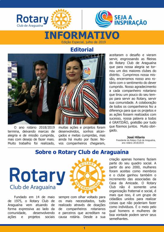 O Rotary Club de Araguaína lança a edição especial de seu Informativo, divulgando sobre as atividades realizadas durante o ano rotário 2018/2019. Em seu editorial, o Presidente 2018-2019, José Hilário Rodrigues deixou a seguinte mensagem.