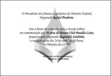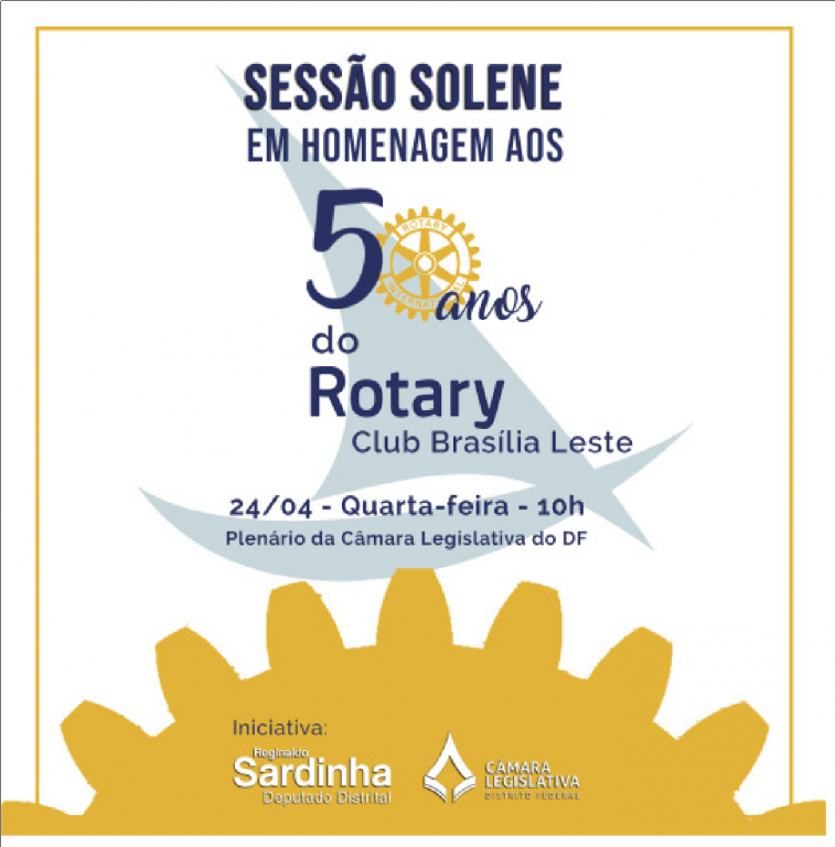 Sessão Solene em Homenagem aos 50 anos do Rotary Club Brasília-Leste, realizada no Plenário da Câmara Legislativa do DF, em 24 de abril de 2019. Missa celebrada pelo Padre Silas Pereira da Catedral Militar Rainha da Paz, no dia 29 de abril de 2019, pelos 50 anos do clube.