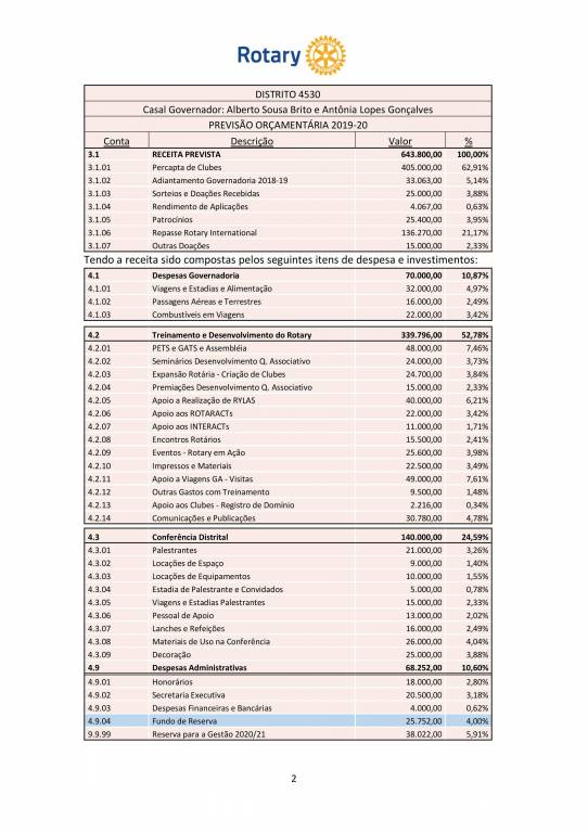 No dia 6 de abril de 2019 foi realizada a Assembleia do Distrito 4530, com os presidentes entrantes do ano 2019/20, tendo como pauta: Capacitação e Discussão, com os seguintes temas desenvolvidos: Liderança; Oratória para Rotary; Metas Distritais; Visita Oficial; Calendário de Eventos e Deliberações.