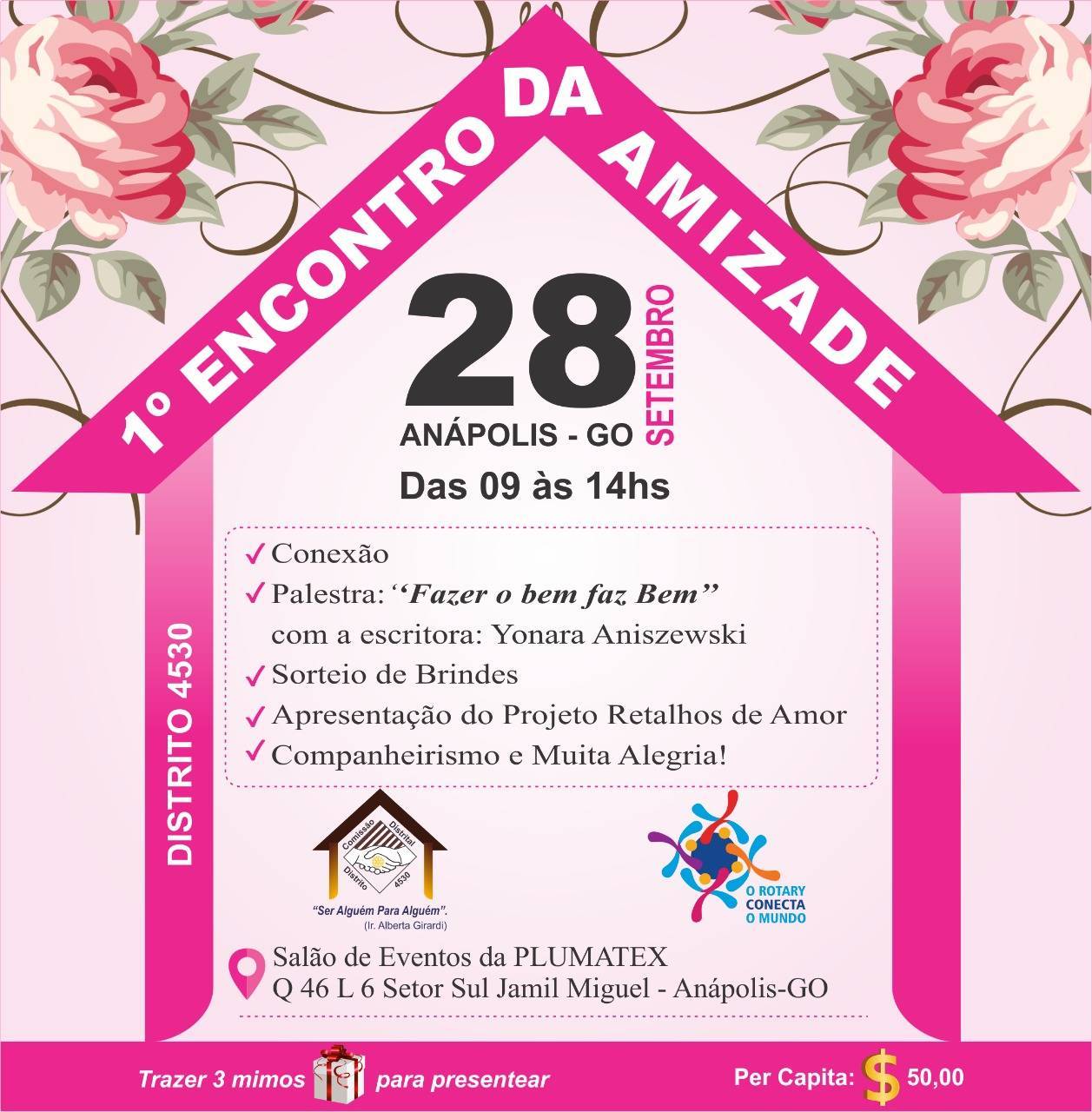 No dia 29 de Setembro de 2019 irá acontecer o 1º Encontro da Casa da Amizade do Distrito 4530, o evento irá ocorrer na cidade de Anápolis - GO, no Salão de Eventos da PLUMATEX.
