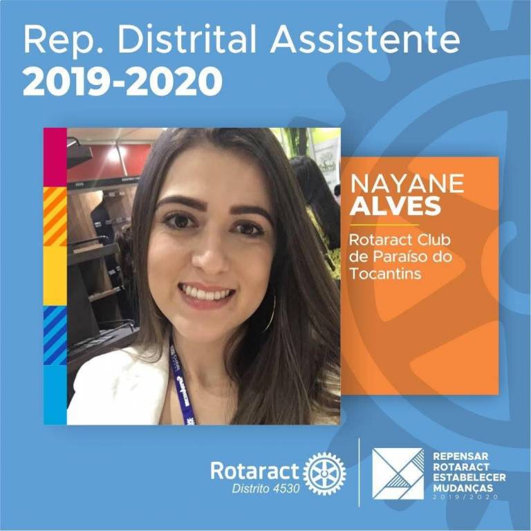 Representante Distrital Assistente (responsável pelos clubes RCT Palmas, RCT Palmas Araguaia Tocantins e RCT Paraíso do Tocantins): Nayane Alves