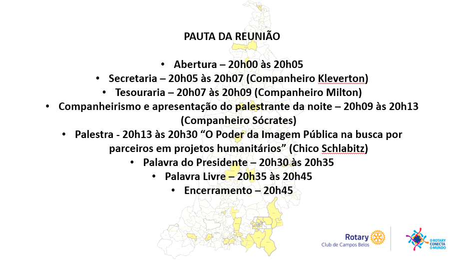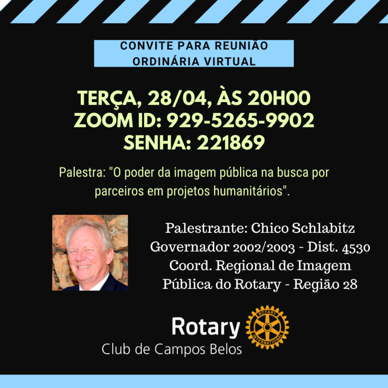 O Rotary Club de Campos Belos convida você a participar de nossa I Reunião Virtual neste ano rotário 2019/2020. Considerando o período de isolamento social, esta é uma forma de continuarmos trabalhando em prol do bem ao próximo.