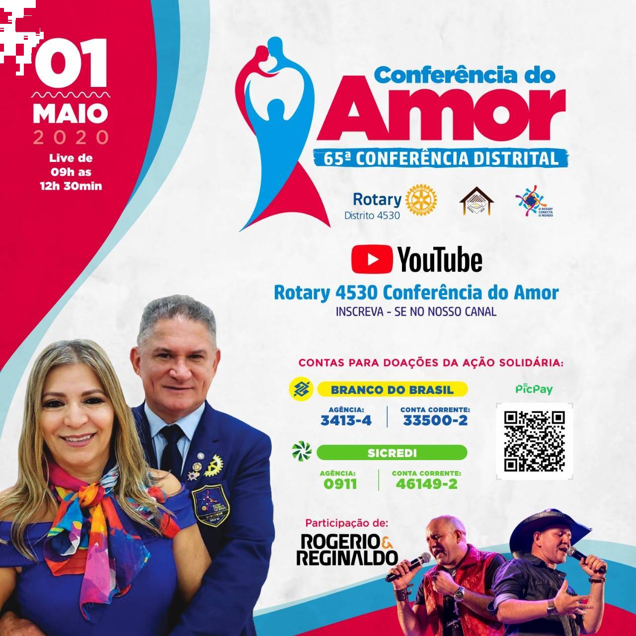 No dia 01 de Maio de 2020 a partir das 09h30min será realizada a primeira conferência online do Distrito 4530, a Conferência do Amor. Para participar basta se inscrever no canal do Youtube da conferência: https://www.youtube.com/channel/UCXrhcz_68SvxJJIP-IRhx1w . A conferência contará com a participação de autoridades rotárias e regionais, não perca!