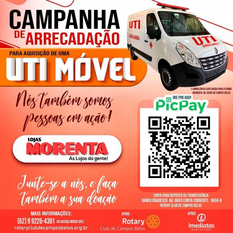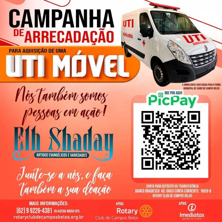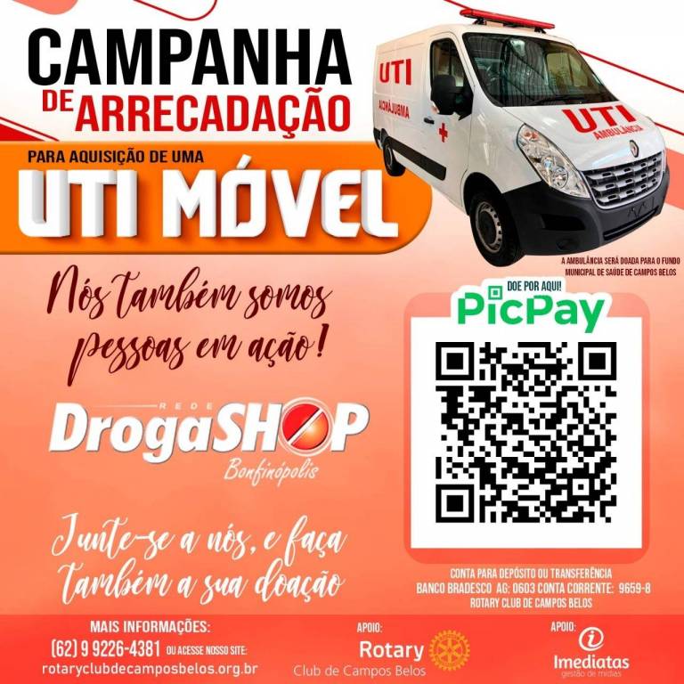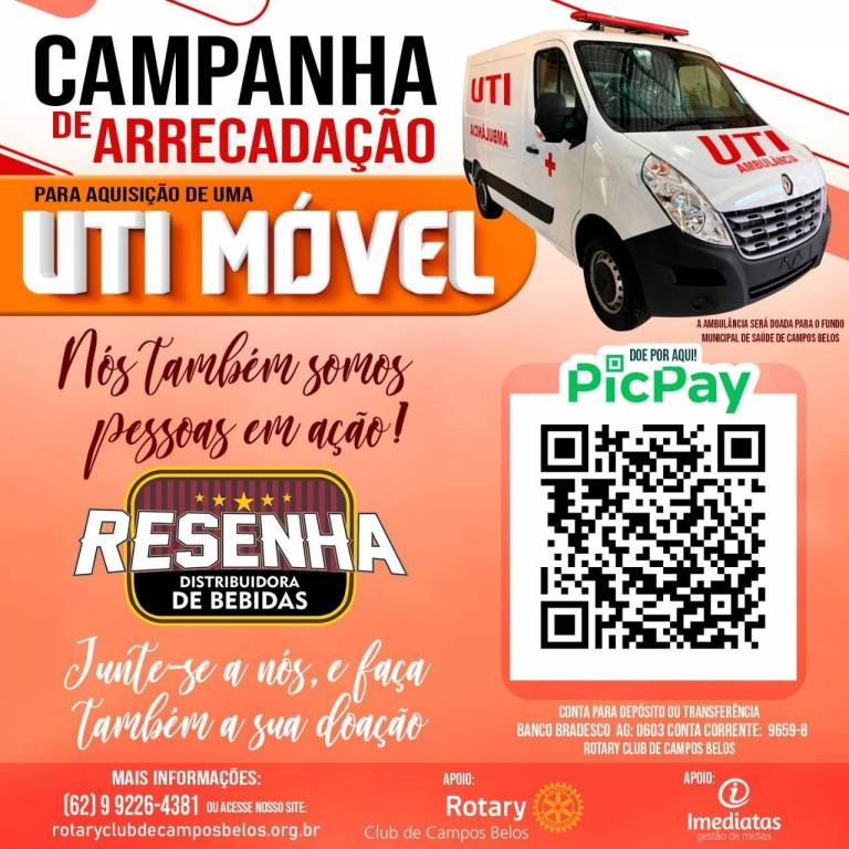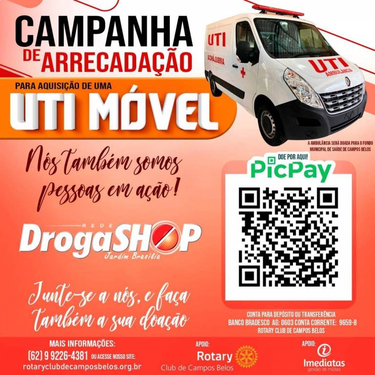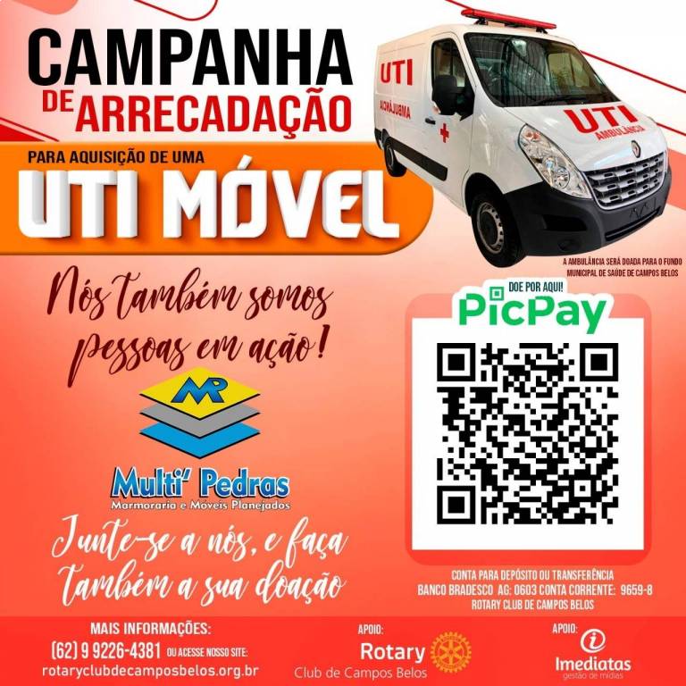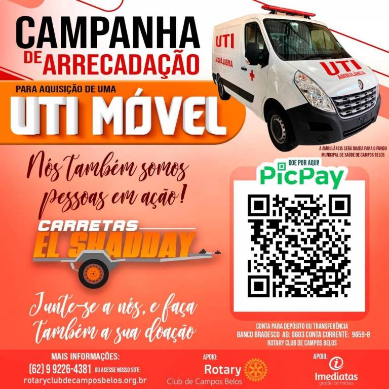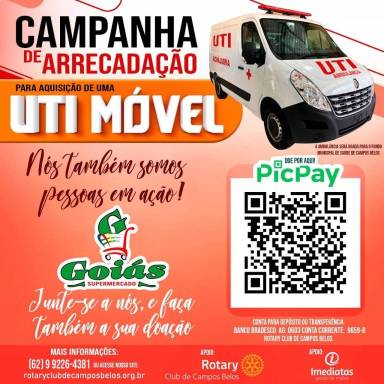 Seja um parceiro deste projeto. É assim que iniciamos o nosso convite. Seja um Rotary Club ou um distrito de Rotary, ou até mesmo empresas ou pessoas físicas, juntos somos mais fortes e tornaremos esse projeto realidade. Hoje foi dada a largada para uma série de participações em lives solidárias de parceiros do Rotary Club de Campos Belos. O objetivo é chegar ao valor necessário para a aquisição de uma Ambulância UTI Móvel que será doada ao município de Campos Belos, nordeste goiano. A cidade de Campos Belos, com aproximadamente 20 mil habitantes, é um polo comercial na região e atende vários municípios da região nordeste de Goiás e Sudeste do Tocantins. A cidade não conta com nenhum leito de UTI e possui apenas ambulâncias convencionais.
