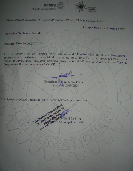 Os materiais foram adquiridos pelo o Distrito 4530 com recursos obtidos do Fundo de Assistência em Caso de Desastres. Mais de R$ 127.000,00 em EPI´s foram adquiridos e estão sendo distribuídos para os clubes do Distrito Federal, de Goiás e do Tocantins. Nesta mesma data, foi encaminhado ao governador do Distrito 4530, Alberto Sousa Brito, um pedido de doação de um equipamento Selene, produzido em parceria com a Universidade de Brasília (UnB).