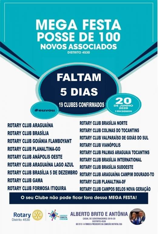No dia 20 de Junho de 2020, as 19 horas e 30 minutos, o Distrito 4530 irá realizar a posse de 100 novos associados em diferentes clubes. A cerimônia irá acontecer de forma online, pela plataforma Zoom. E já tem a presença confirmada de diversas autoridades rotárias, entre elas o Diretor do Rotary International, Mário Cesar.