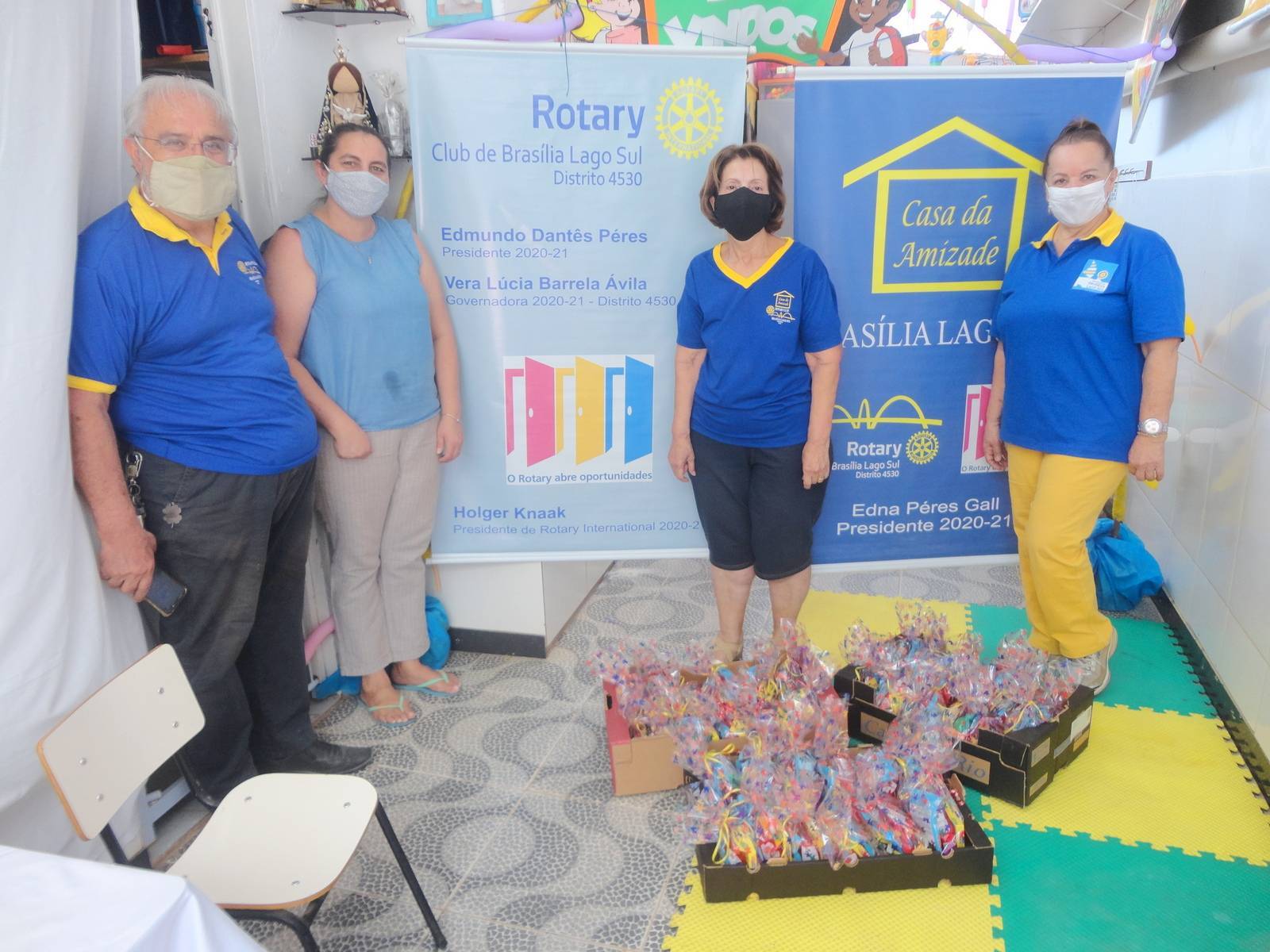 A Casa da Amizade do Rotary Club Brasília Lago Sul presidida pela Edna Peres, acompanhada da Graça Cardoso, presidente do clube Edmundo Peres e Jordivar Filgueira, doou dia 9/10 às 11:30 para festejar o dia das crianças, 36 kits de doces e guloseimas para as crianças da creche São Francisco na cidade da Estrutural - DF.