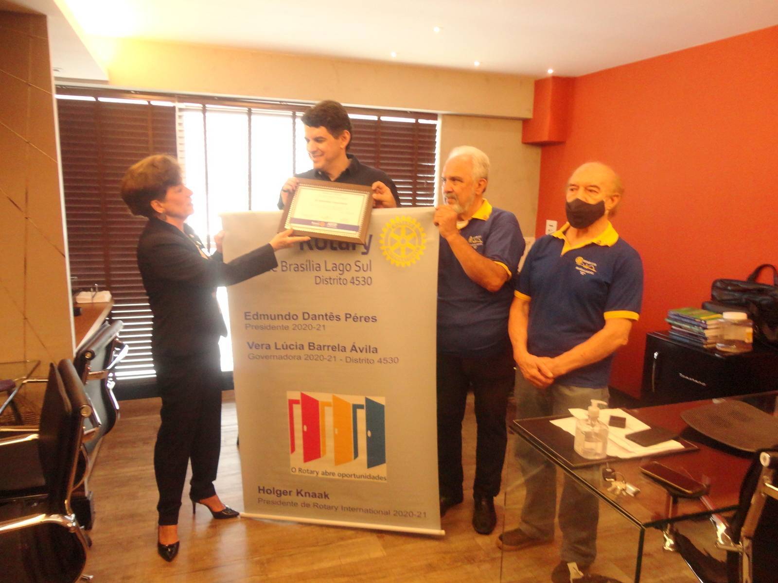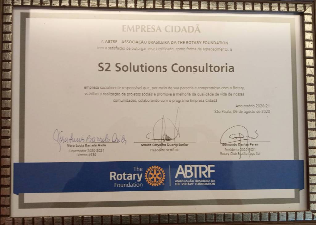 Rotary Club Brasília Lago Sul representado pelo presidente Edmundo Peres e Jordivar Filgueira, acompanhados da Governadora Vera Ávila e seu esposo companheiro Jose Ávila, o presidente da Comissão Distrital de Fundação Rotária Gd 2002-3 Chico Schlabitz, dia 6 de novembro às 10:00 horas visitaram a empresa S2 Solutions Consultoria para entregar solenemente os reconhecimentos, referente à segunda doação de 1.000 dólares à ABTRF-Associação Brasileira da The Rotary Foundation, feita pelo Diretor Presidente da empresa Dr. Washington Jose de Lyra Junior.